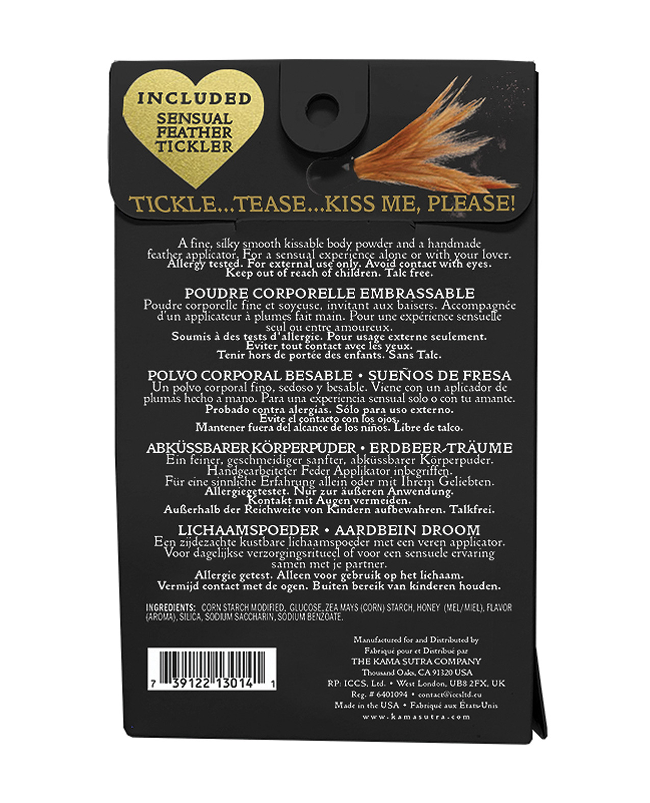Kissable, moisture-wicking body powder that leaves skin silky-soft and delicately scented. Includes a sexy feather applicator. Lightweight formula wicks away moisture, leaving skin soft and smooth. Use anywhere on the body.