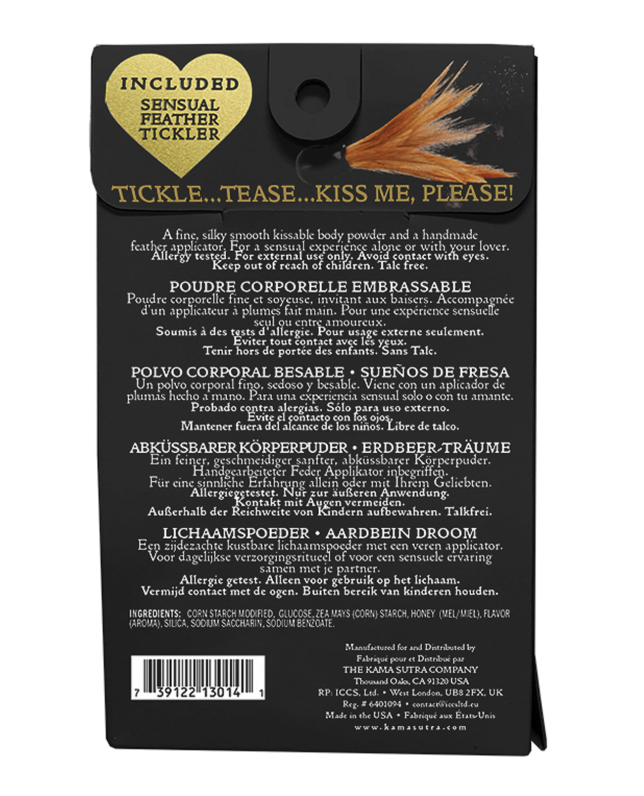 Kissable, moisture-wicking body powder that leaves skin silky-soft and delicately scented. Includes a sexy feather applicator. Lightweight formula wicks away moisture, leaving skin soft and smooth. Use anywhere on the body.